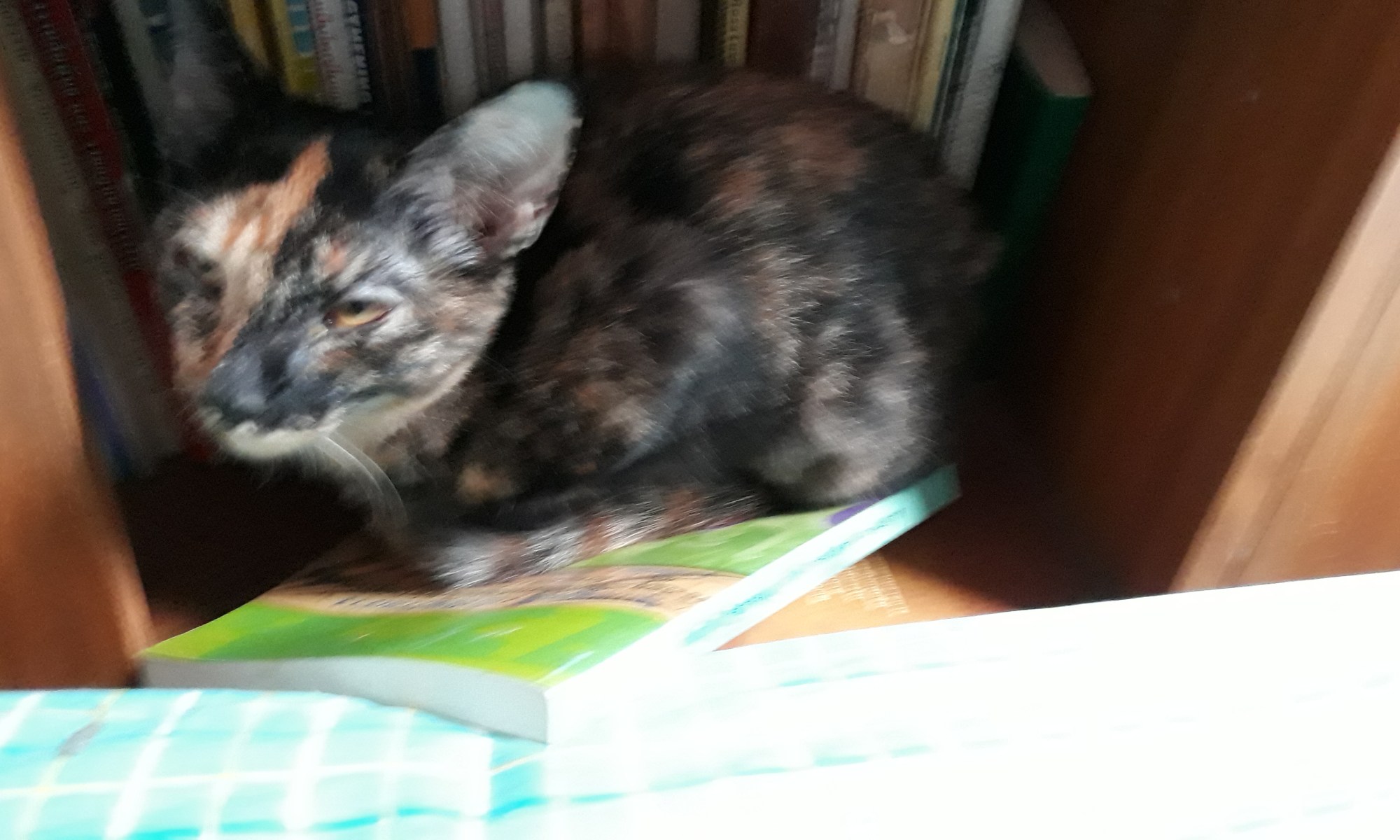 ตัวนี้อายุราว 3 เดือน เกิดที่วัดใกล้บ้าน อยู่ใต้ถุนกุฏิ วันหนึ่งมันปีนบันใดกุฏิเห็นพระประจำกุฏินี้กำลังนั่งนับเงินอยู่กับสีกาแสนสวยตามลำพัง มันส่งเสียงร้องเจี๊ยวจ้าวออกมา เลยถูกพระรูปนั้นใช้ปืนสไนเปอร์ไล่ยิงตะเพิดออกมาแล้วให้เจ้าตูบหน้าโง่ไล่กัด มันวิ่งหนีหัวซุกหัวซุน แล้วเข้ามาลี้ภัยอยู่ในบ้านผมอยู่หลายวัน ผมพบมันที่ชั้นหนังสือ ขณะที่ออกมาจากที่ซ่อนตัวในสภาพที่เป็นแมวขี้กลัว ขี้ตกใจมาก มันวิ่งหนีอย่างรวดเร็วแล้วก็หายไปอีก แต่แล้วมันก็วนเวียนเข้ามาที่บ้านเพราะบ้านหลังนี้เป็นแหล่งอาหารของแมวเป็นอย่างดี คราวนี้อยู่ในสภาพเป็นแมวป่วย ต้องจับส่งหาหมอ หมดค่ายาไปหลายกะตังค์ ที่หมดไปหลายกะตังค์ก็เพราะว่า ผมไม่ใช่คนรวย แต่มันก็ยังขี้กลัว ไม่ไว้วางใจมนุษย์อย่างผมอีก