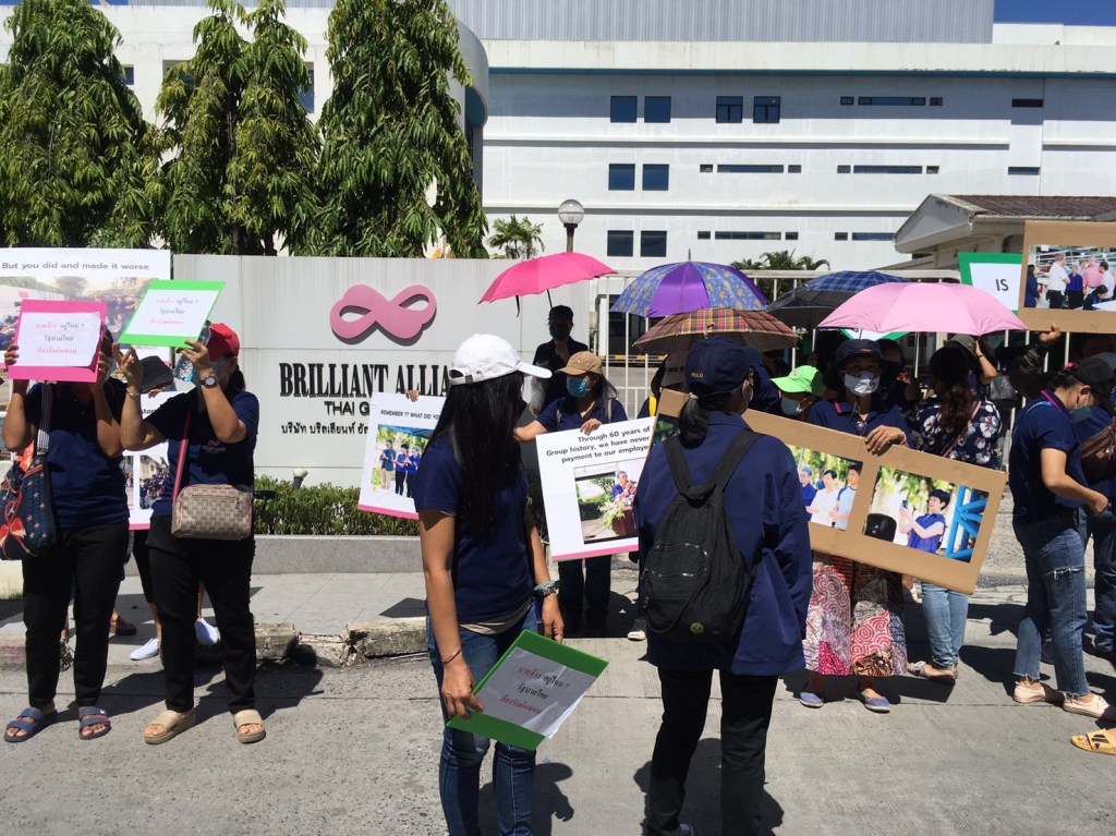 นางจิตณวัชรี พะนัด ประธานสหภาพแรงงานไทรอัมพ์ฯกล่าวว่า บริษัท บริลเลียนท์ อัลไลแอนซ์ ไทย ฯจดทะเบียนบริษัทเมื่อเดือนมิถุนายน 2562 ทำการเช่าเครื่องจักรและโรงงานจากบริษัทบอดี้แฟชั่น ทำการผลิต ในวันที่ 29 ตุลาคม 2562ได้มีการเลิกจ้างพนักงานไป 333 คน ไม่ได้รับค่าชดเชยตามกฎหมาย เรื่องนี้ยังค้างอยู่ในศาลแรงงาน หลังจากนี้บริษัทได้โยกย้ายถ่ายเททรัพย์สินไปโรงงานที่เวียดนาม จนกระทั่งมาปิดกิจการเมื่อวันที่ 11 มีนาคม 2564 เลิกจ้างคนงาน 1388 คน คาดว่า ไม่เหลือทรัพย์สินในการจ่ายเงินค่าชดเชยให้กับลูกจ้าง