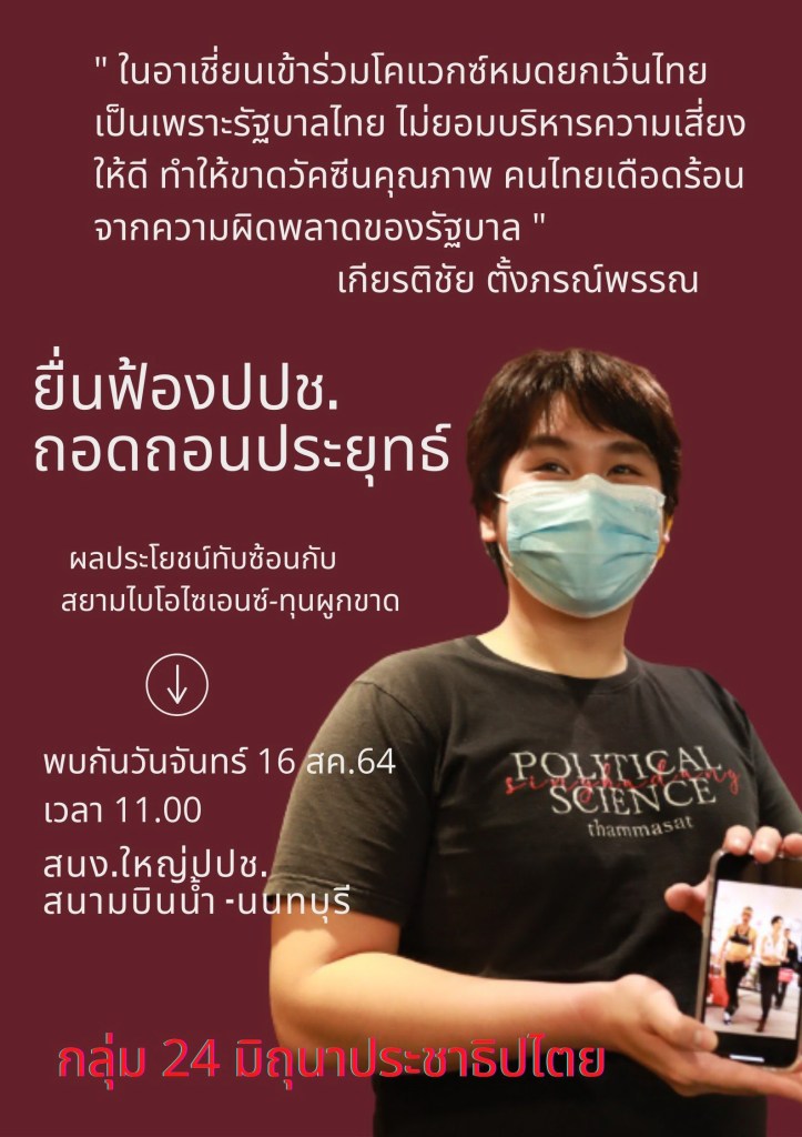 เกียรติชัย ตั้งภรณ์พรรณ นศ.มธ. ศึกษาถึงการที่ไทยเป็นประเทศเดียวในอาเชียน ไม่เข้าร่วมโคแวกซ์ ส่งผลให้ ไม่สามารถจัดหาวัคซีนคุณภาพมาให้ประชาชนได้ โดยไปเลือกที่จะให้บริษัทสยามไบโอไซเอนซ์ ผู้ผลิตแอสตร้าเซเนก้า แต่ถึงเวลาไม่ส่งมอบได้ตามกำหนด แล้วไปซื้อวัคซีนชิโนแวคซ์ที่มีผลข้างเคียงมาแทน ทำให้ผู้ติดเชื้อโควิดและเสียชีวิตมากมาย ทั้งหมดเป็นพฤติกรรมส่อไปในทางทุจริต เอื้อประโยชน์ให้นายทุนผูกขาด