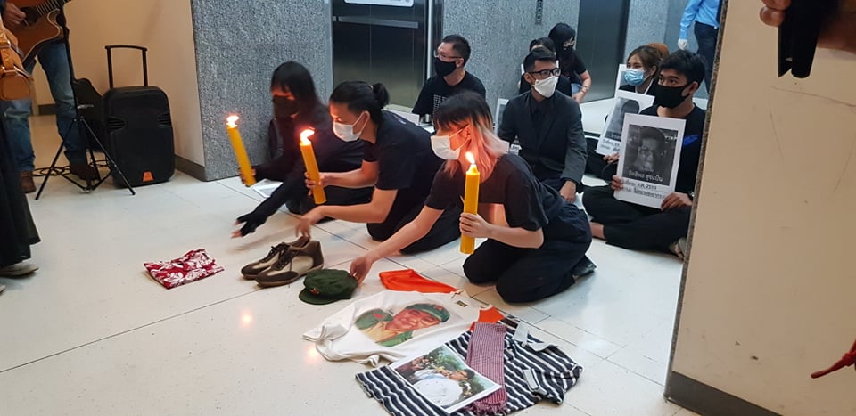 กลุ่มโมกหลวง 15 คนแต่งกายชุดดำรวมตัวที่ชั้นสอง ตั้งแถวถือรูปผู้ถูกบังคับสูญหาย 9 คน อีกสามคนถือเทียนแท่งใหญ่สงบนิ่ง มีอาเล็กซ์ โชคร่มพฤกษ์ ศิลปินเพื่อชีวิตร้องเพลงนักสู้ธุลีดิน โดยเจ้าหน้าที่ในอาคารมายืนดู ทั้งหมดเดินขึ้นไปยังชั้น 6 ได้นำของใช้ส่วนตัวของผู้ถูกบังคับสูญหายคือหมวกดาวแดงของสุรชัย ด่านวัฒนานุสรณ์ เสื้อยืดของสยาม ธีรวุฒิ รองเท้าผ้าใบของอิทิพล สุขแป้น และเสื้อฮาวายของวันเฉลิม สัตย์ศักดิ์สิทธิ์ นำมาแสดง โดยมีการอ่านบทกวีรำลึกถึง 9 คนผู้ถูกบังคับสูญหาย