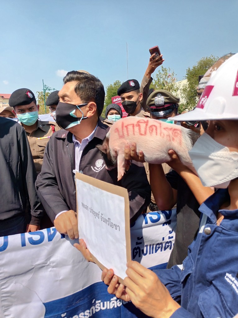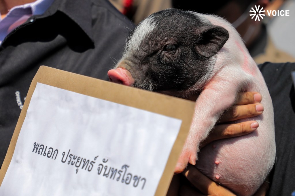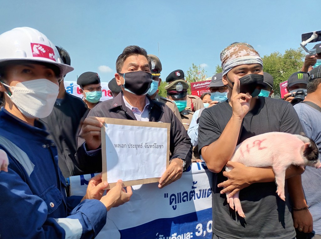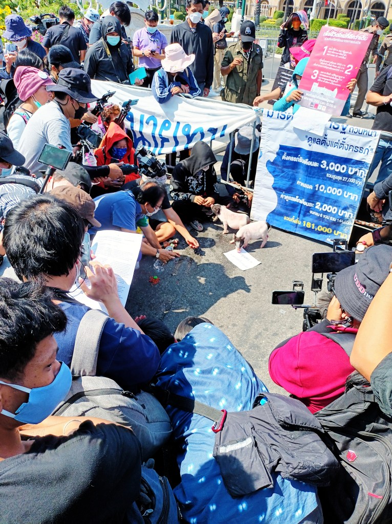 เวลา 12.00 น.นายสมพาศ นิลพันธ์ ที่ปรึกษาสำนักงานปลัดสำนักนายกรัฐมนตรี ออกมารับหนังสือข้อเรียกร้อง โดยกลุ่มทะลุฟ้า นำลูกหมูสองตัวมามอบให้นายกรัฐมนตรี และสาธิตการเลี้ยงหมูให้ดูเป็นตัวอย่าง โดยมีข้อความเขียนที่ตัวหมูว่า ปกปิดโรคระบาด