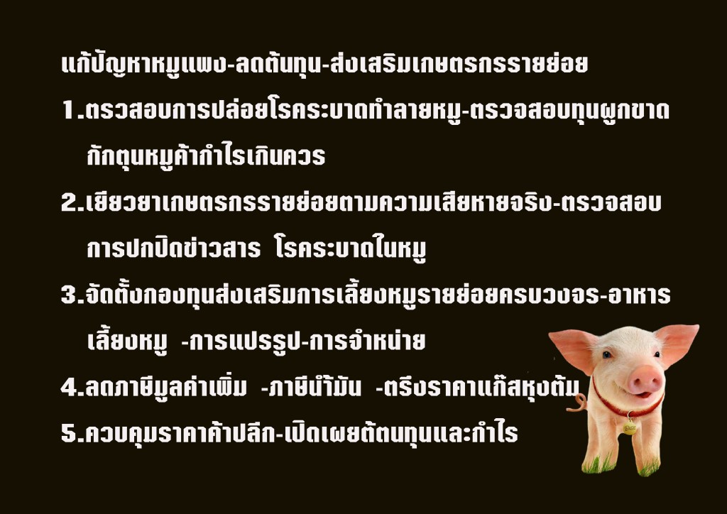 1.ตรวจสอบการแพร่ระบาดของโรคอหิวาต์แอฟริกาในสุกร (African swine fever: ASF)ว่ามีการนำมาปล่อยแพร่ระบาดเพื่อทำลายประชากรหมูในกลุ่มเกษตรกรผู้เลี้ยงหมูรายย่อย ทำให้บริษัทขนาดใหญ่ผูกขาดแทบตลอดห่วงโซ่การผลิต ครอบคลุมการผลิตอาหารสัตว์ และการกระจายตลาด ได้กำไรทั้งการส่งออกและกำหนดราคาสูงในตลาด ทั้งนี้ปรากฏว่ารัฐบาลได้ปกปิดข่าวสารการแพร่ระบาดเอื้อประโยชน์ให้บริษัทผูกขาดได้ประโยชน์จากการส่งออก และขอให้ตรวจสอบ การค้าปลีกเนื่องจากพบว่า หมูในห้างสรรพสินค้า เป็นหมูกักตุนข้ามปี จึงเป็นไปได้ว่า มีการกักตุนหมูไว้ก่อนล่วงหน้าและนำมาจำหน่ายในช่วงหมูราคาแพงทำกำไรมหาศาล ทั้งนี้รัฐบาลต้องเยียวยาเกษตรกรผู้เลี้ยงหมูรายย่อยตามความเสียหายจริง จัดตั้งกองทุนส่งเสริมเกษตรกรเลี้ยงหมูรายย่อย ตรวจสอบการผูกขาดและการกักตุนสินค้าด้วยการกำหนดราคาสูง ทำการควบคุมราคาสินค้าและลดราคาสินค้าไม่ให้มีการผูกขาดและการค้ากำไรเกินควร เปิดเผยต้นทุนและกำไรในสินค้าทุกชนิด