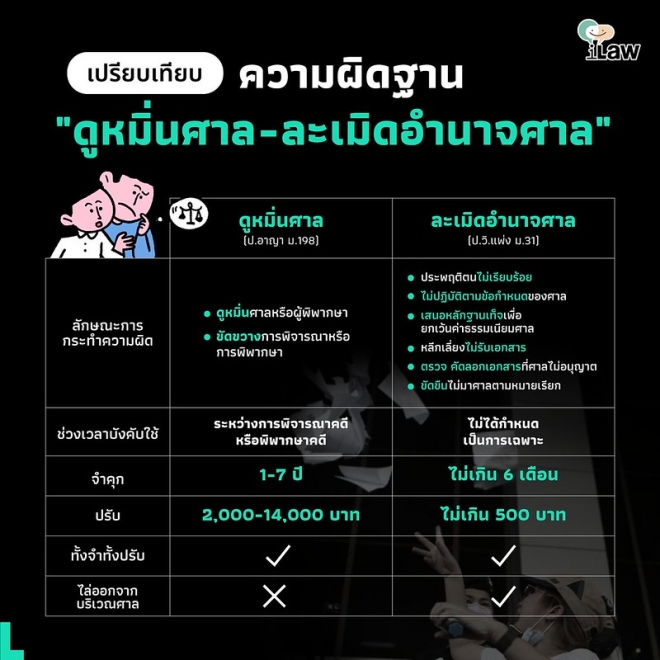 สำหรับเนื้อหา ในประมวลกฎหมายอาญา มาตรา 198 บัญญัติว่า “ผู้ใดดูหมิ่นศาลหรือผู้พิพากษาในการพิจารณาหรือพิพากษาคดี หรือกระทำการขัดขวางการพิจารณาหรือพิพากษาของศาล ต้องระวางโทษจำคุกตั้งแต่หนึ่งปีถึงเจ็ดปี หรือปรับตั้งแต่สองพันบาทถึงหนึ่งหมื่นสี่พันบาท หรือทั้งจำทั้งปรับ”
