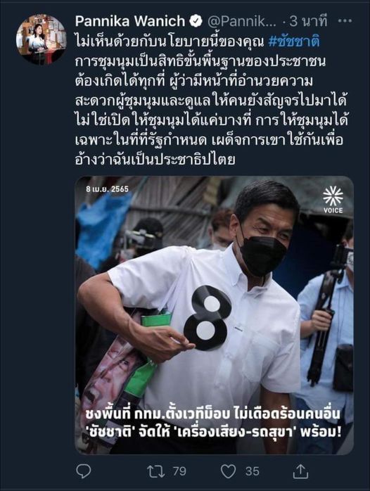 จึงเรียนมาด้วยความนับถือ เพื่อให้เข้าใจได้ชัดเจนยิ่งขึ้น ขอให้หลีกเลี่ยงการพูดที่ทำให้เข้าใจได้ว่าจะจัดสถานที่อำนวยความสะดวกให้ผู้ชุมนุมไปที่สนามกีฬาไทย-ญี่ปุ่น หรือ ลานคนเมือง ซึ่งนั่นไม่ใช่สถานที่อันควรชุมนุมประท้วงของประชาชน และไม่ใช่หน้าที่ของกทม.ที่จะไปควบคุมการชุมนุมของประชาชนด้วยการจำกัดพื้นที่การชุมนุม ดังที่คุณช่อ พรรณิการ์ ช่อวานิช ได้แสดงความคิดเห็นเกี่ยวกับเรื่องนี้ไว้แล้ว