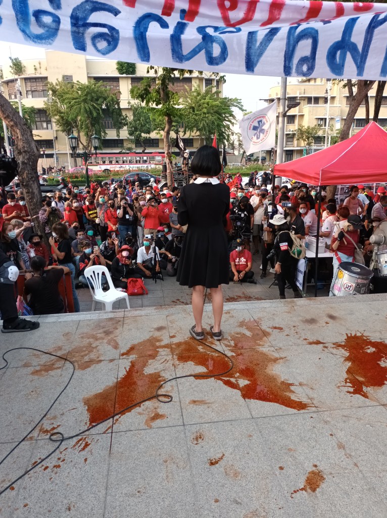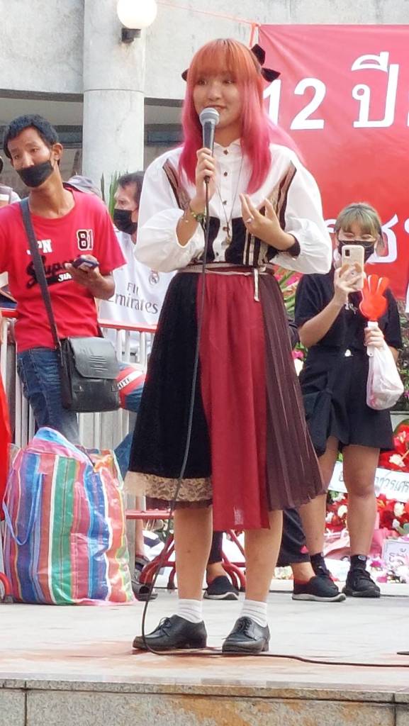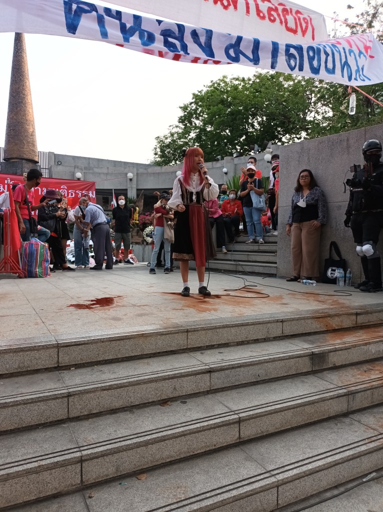 “คนเสื้อแดงที่เราสู้มาแล้ว 10 กว่าปี จะทิ้งลูกทิ้งหลานวันนี้ได้ยังไง? เพราะเราเคยเจ็บมาก่อน เราเคยตายมาก่อน ไอ้คนพวนี้มันทำผังล้ำเจ้า ใส่ชื่อผม ใส่ชื่อพวกเรามากมาย บอกว่าไอ้พวกนี้คิดร้ายทำลายบ้านเมือง ประสงค์ร้ายต่อสถาบันฯ เผยแพร่ผังล้มเจ้า กระพือโหมจนคนบางคนหลงเชื่อ เปิดหัวใจให้ฆ่าได้ ฆ่าแล้วก็ออกมาล้างถนน แล้วก็เดินหน้าชีวิตเหมือนไม่มีอะไรเกิดขึ้นต่อไป
