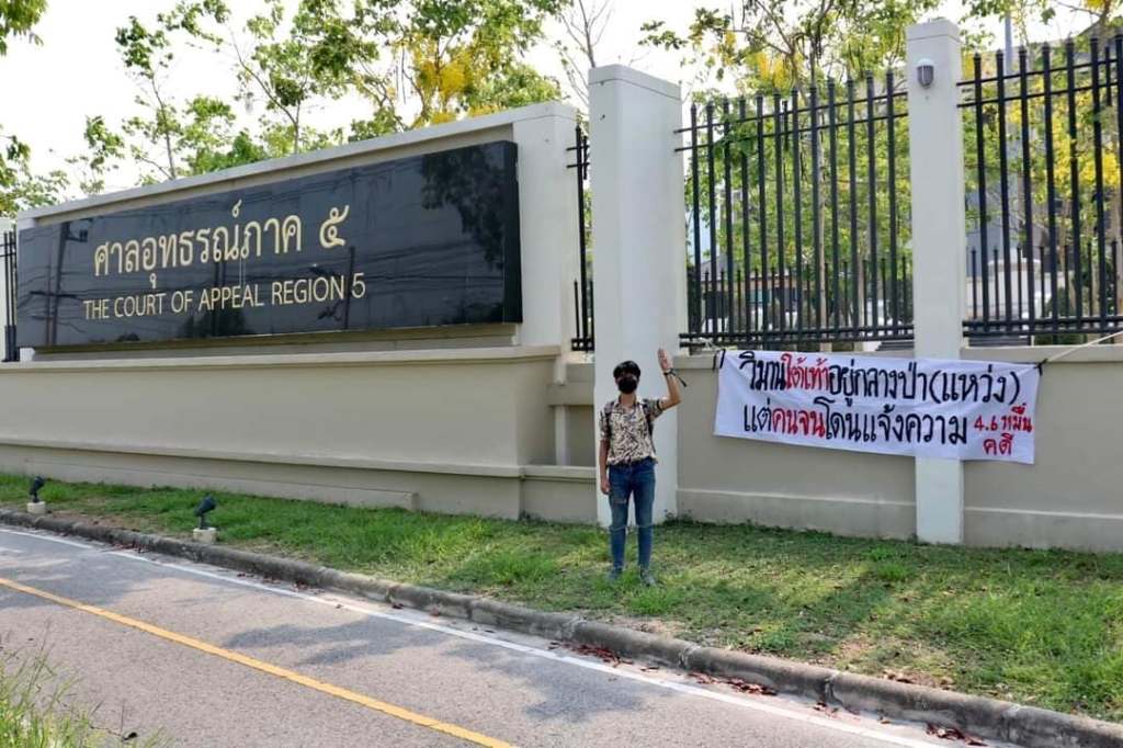 วันที่ 12 เมษายน 2565 พชร คำชำนาญ นักเคลื่อนไหวประเด็นที่ดินและสิทธิชาติพันธุ์พร้อมเพื่อนติดป้ายหน้าศาลอุทธรณ์ภาค ๕ โดยป้ายผ้าดังกล่าวมีข้อความว่า “วิมานใต้เท้าอยู่กลางผืนป่า(แหว่ง) แต่คนจนถูกแจ้งความ 4.6 หมื่นคดี” เพื่อทวงถามความยุติธรรมจากกรณี “นโยบายทวงคืนผืนป่า” ของพลเอกประยุทธ์ จันทร์โอชา ที่มีคำสั่ง คสช. ที่ 64/2547 เรื่องการปราบปรามและการหยุดยั้งการบุกรุกทรัพยากรป่าไม้ กล่าวอ้างการทวงคืนผืนป่าจากนายทุนเพื่อผลประโยชน์ของประชาชน กำหนดให้ประเทศไทยต้องมีผืนป่า 40 เปอร์เซ็นต์ แต่ในความเป็นจริง นโยบายนี้กลับไม่ได้เอื้อประโยชน์แก่คนจนหรือทวงคืนทรัพยากรกับนายทุนอย่างที่กล่าวอ้าง ในทางกลับกันผู้ได้รับผลกระทบจากการดำเนินคดีเป็นชาวบ้าน พี่น้องชาติพันธุ์ที่ดำรงชีวิตและอยู่ร่วมกับป่ามายาวนาน เมื่อเทียบกับกรณีการสร้างบ้านพักศาลอุทธรณ์ภาค 5 ที่บุกรุกเข้าไปยังเขตป่าที่อุดมสมบูรณ์ กลับเป็นเรื่องที่รัฐสามารถปฏิบัติได้ แม้จะอ้างว่าเป็นที่ดินของธนารักษ์ก็ตาม นับเป็นความเหลื่อมล้ำและการเลือกปฏิบัติที่เกิดขึ้นอย่างชัดเจน