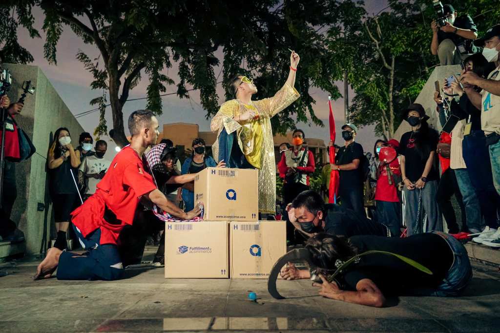 ทั้งนี้มีการแสดงละครของกลุ่ม 24 มิถุนาประชาธิปไตย เรื่อง “ไพร่สร้างวังเวียง ไพร่เลี้ยงแผ่นดิน” ซึ่งได้แรงบันดาลใจมาจากบทเพลงของวัฒน์ วรรลยางกูร การแสดงจบด้วยการกล่าวถึง การแสดงชุดนี้ขาดหายไปหนึ่งคนคือทานตะวัน ตัวตุลานน์ ซึ่งถูกคุมขังด้วยมาตรา 112 และกำลังอดอาหารเรียกร้องสิทธิการประกันตัวอยู่ในขณะนี้ ต่อด้วยการปราศรัยของนายโสภณ สุรฤทธ์ธำรง หรือ เก็ต โมกหลวง ครูใหญ่ อรรถพล บัวพัฒน์ และ ตี้ วรรณลี เยาวชนคนรุ่นใหม่ที่มาร่วมรำลึกการจากไปของศิลปินแนวรบทางวัฒนธรรมคนสำคัญอย่างวัฒน์ วรรลยางกูร โดยเก็ตได้กล่าวขอบคุณคนรุ่นตุลาจนถึงคนเสื้อแดงที่ทำให้เขาได้ตาสว่าง พร้อมกับสัญญาว่าจะพาผู้ลี้ภัยกลับบ้านรวมถึงผู้ลี้ภัยที่เสียชีวิตหรือถูกอุ้มหายสักวันพวกเขาจะได้ร่วมยินดีด้วยกัน ทั้งยังกล่าวถึงความใฝ่ฝันของเขาว่า อยากเห็นประเทศนี้เป็นสาธารณรัฐประชาธิปไตยประชาชนไทย