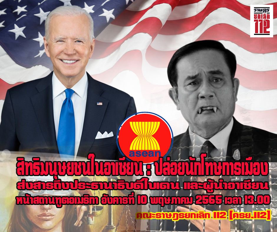 ขอเชิญราษฎรทั้งหลายรวมตัวกันหน้าสถานทูตอเมริกา ถนนวิทยุในวันอังคารที่ 10 พฤษภาคม 2565 เวลา 13.00 น. เพื่อส่งสารถึงประธานาธิบดีโจ ไบเดน และ ผู้นำอาเซียน ให้คำนึงถึงสถานการณ์สิทธิมนุษยชนในประเทศไทย เป็นวาระสำคัญการหารือ เพื่อให้รัฐบาลไทยปล่อยตัวนักโทษการเมือง 11 คน และ แก้ไขกฎหมายอาญายกเลิกมาตรา 112 เพื่อเป็นหลักประกันในสิทธิเสรีภาพประชาธิปไตยของคนไทย และประชาคมอาเซียน