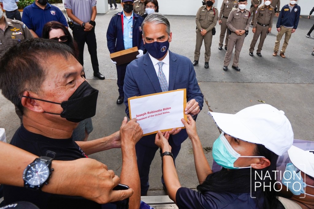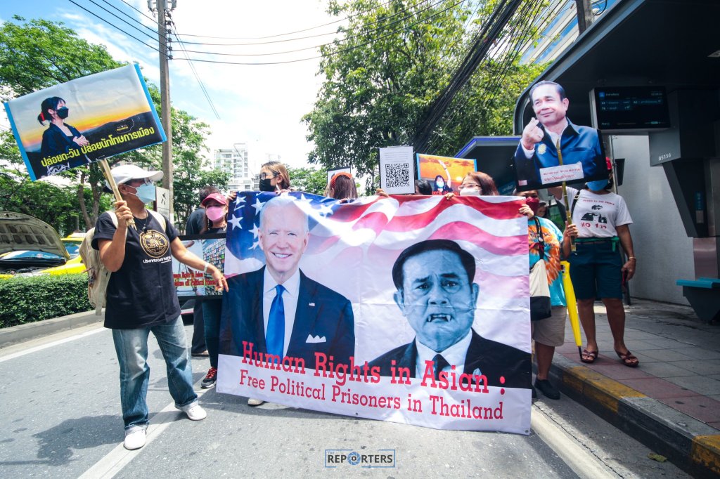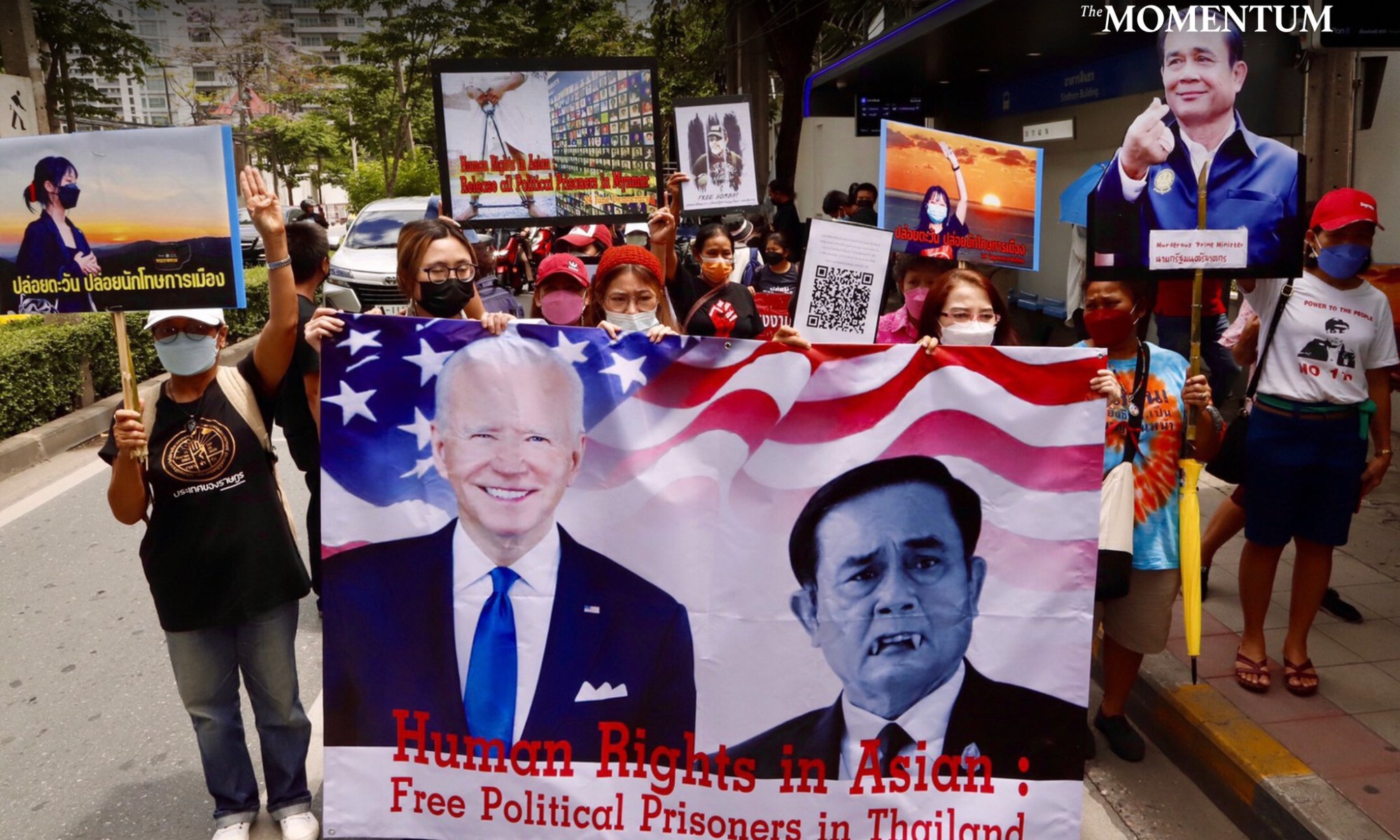ผู้ชุมนุมถือป้ายภาษาอังกฤษข้อความว่า Human Rights in Asian : Free political Prisoners และถือรูปนักโทษการเมือง 11 คนที่ถูกคุมขังอยู่ที่เรือนจำ โดยไม่ได้รับสิทธิการประกันตัว นอกจากนี้ยังมีป้ายข้อความ Release all Political Prisoners in Myanmar ให้ปล่อยนักโทษการเมืองในเมียนม่าทั้งหมดอีกด้วย มีการนำศาลไม้ มีรถถังอยู่บนหลังคา ภายในศาลมีไดโนเสา 3 ตัว และนางรำ หน้าศาล กิจกรรมภายในงานมีการปราศรัยถึงการละเมิดสิทธิมนุษยชนในเรื่องการใช้มาตรา 112 หรือกฎหมายหมิ่นพระบรมเดชานุภาพ ปิดกั้นเสรีภาพการแสดงความคิดเห็นและการเรียกร้องให้ปฏิรูปกษัตริย์ ตามครรลองประชาธิปไตย มีผู้ปราศรัยภาษาอังกฤษอาทิเช่น ธิษะณา ชุณหะวัณ เตย ตีนไก่ปฏิวัติ ธนพร วิจันทร์ ในเวลา 14.00 น.แกนนำครย.112 โดยธนพร วิจันทร์ และสมยศ พฤกษาเกษมสุข ยื่นหนังสือถึงประธานาธิบดีโจ ไบเดน มี เควิน เอ็ม แม๊คคาวน์ เจ้าหน้าที่ฝ่ายการเมือง สถานทูตสหรัฐออกมารับหนังสือ ขณะที่ ครย.112 กล่าวขอบคุณสถานทูตและหวังว่า รัฐบาลสหรัฐจะดำเนินการอย่างจังในเรื่องนี้