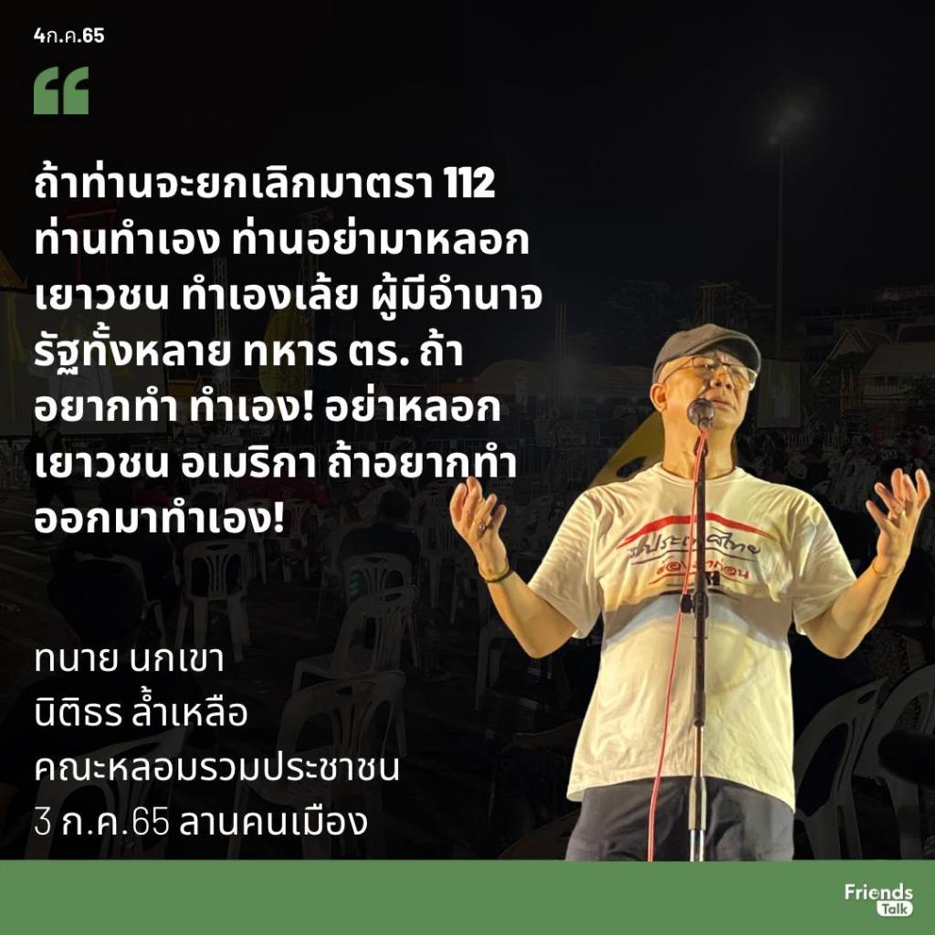 นายนิติธร ล้ำเหลือ หรือทนายความนกเขา แกนนำคณะหลอมรวมประชาชน ขึ้นปราศรัย แฉ ผู้มีอำนาจรัฐทั้งทหาร ตำรวจ อยู่เบื้องหลังการเคลื่อนไหวยกเลิกมาตรา 112 โดยกล่าวว่าถ้าทหารตำรวจอยากทำ ให้ทำเองอย่าหลอกเยาวชน อเมริกาถ้าอยากทำ ให้ออกมาทำเอง “