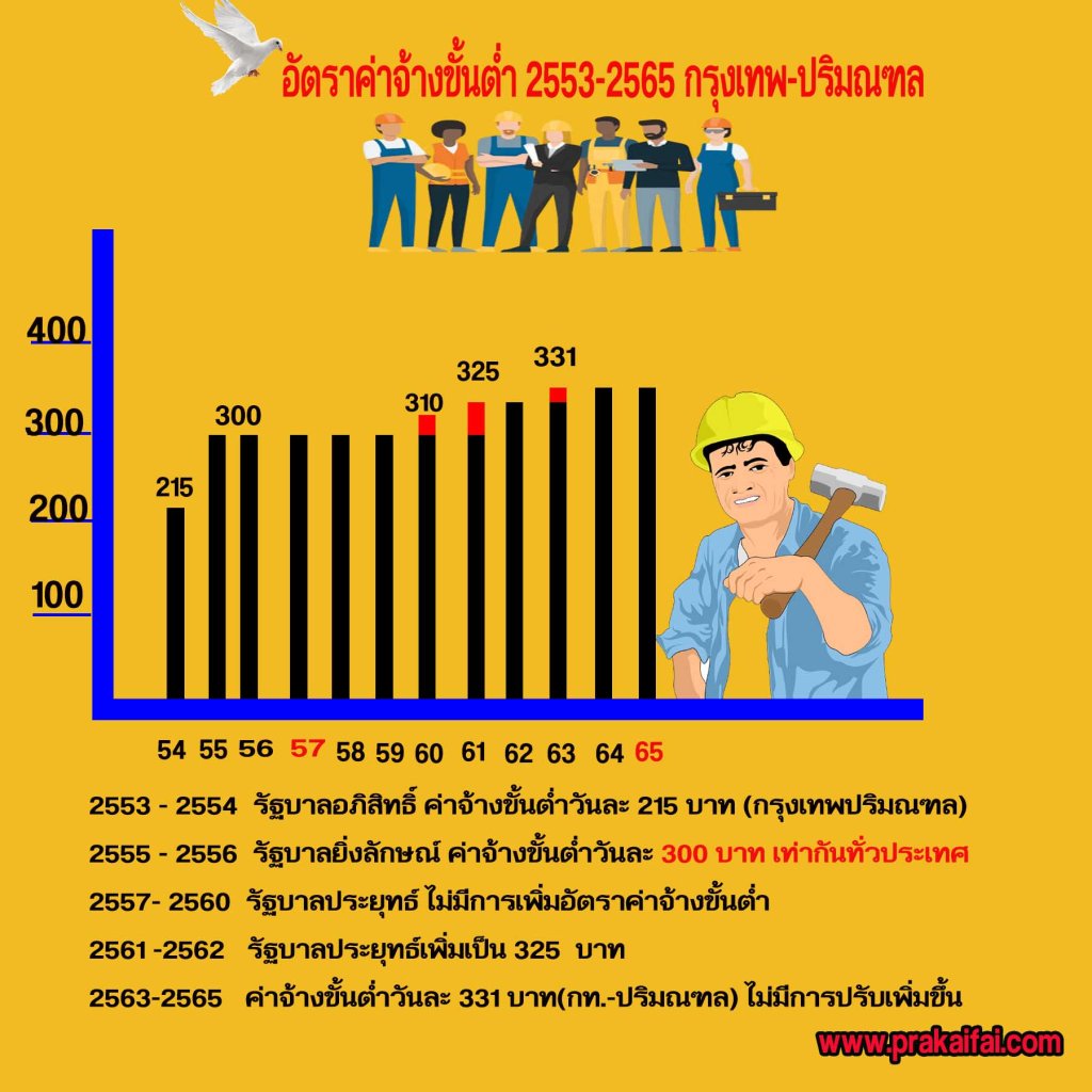 ในช่วง 8 ปี ของรัฐบาลประยุทธ์ มีการปรับเพิ่มค่าจงขั้นต่ำที่น้อยมาก จากจุดเริ่มต้นในปี 2555-2556 รัฐบาลยิ่งลักษณ์เพิ่มค่าจ้างขั้นต่ำจากวันละ 215 บาทเป็น 300 บาท เพิ่มขึ้น 39.53 เปอร์เซ็นต์ แต่พอประยุทธ์ทำรัฐประหารในปี 2557 ไม่มีการปรับเพิ่มค่าจ้างขั้นต่ำจนถึงปี 2560 จึงเพิ่มขึ้นเป็นวันละ 310 บาทหรือเพิ่มขึ้น 3.33 % ปี 2561 เพิ่มเป็น 325 บาทหรือเพิ่มขึ้น 4.83 % และในปี 2563 เพิ่มเป็น 331 บาทหรือเพิ่มขึ้น 1.84 % ซึ่งเป็นการเพิ่มขึ้นในอัตราที่เชื่องช้าและเพิ่มขึ้นน้อยมาก ในขณะที่ค่าครองชีพเพิ่มขึ้นในทุกปีอย่างก้าวกระโดด ย่อมทำให้ค่าจ้างที่แท้จริงต่ำลงไปอีก