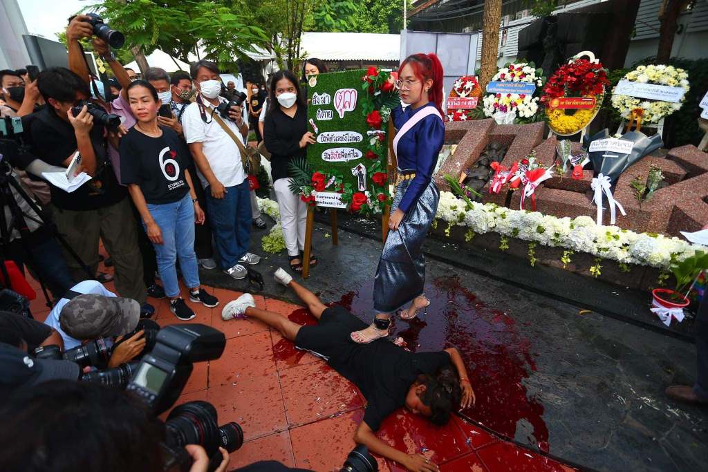 ถัดจาก ครย. 112 เป็นการวางพวงมาลาจากกลุ่มทะลวังนำโดย ใบปอ และ บุ้ง โดย ใบปอได้แต่งชุดไทย ใส่รองเท้าส้นสูง ยืนเหยียบบนหลังของผู้แสดงเป็นศพผู้เสียชีวิตและนำสีแดงมาสาดลงบนพื้น เป็นการแสดงให้เห็นว่า ฆาตกรในเหตุการณ์ 6 ตุลาคม 2519 ยังลอยนวลอยู่ ได้รับความสนใจจากสื่อมวลชนที่มาทำข่าวในวันนี้ แต่ภาพข่าวนี้ สื่อมวลชนหลายสำนักไม่สามารถรายงานข่าวได้ด้วยเกรงกลัวต่อมาตรา 112 ซึ่งการจัดงาน 46 ปี 6 ตุลาคม 2519 ในปีนี้ทางผู้บริหารมหาวิทยาลัยมีการเข้มงวดมากเป็นพิเศษในการควบคุมไม่ให้มีการพูดถึง ผู้ที่อยู่เบื้องหลังสังหารหมู่ประชาชน