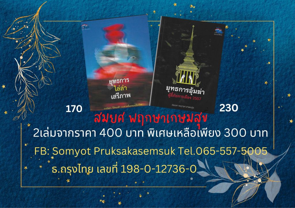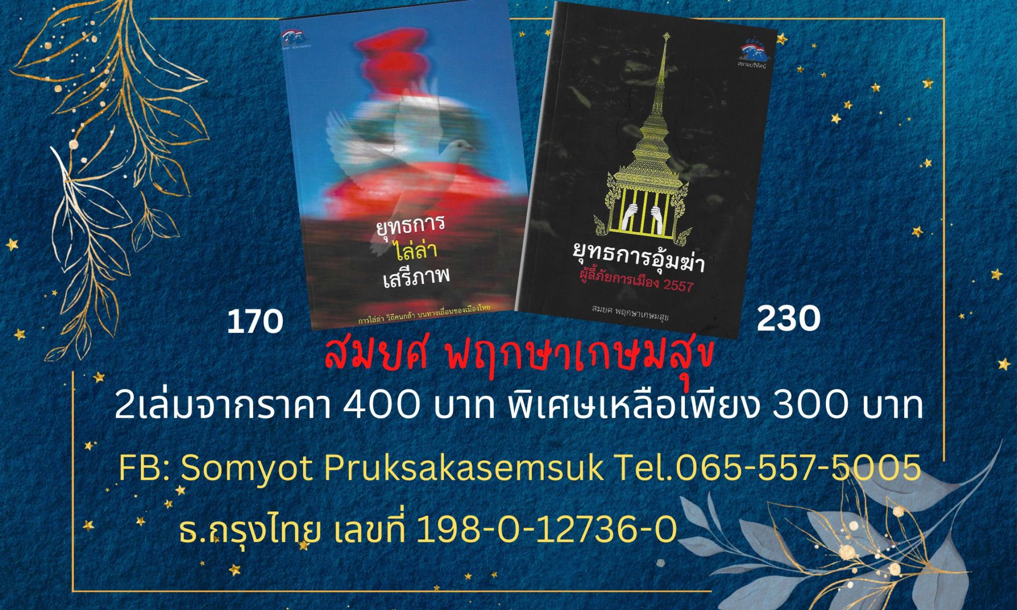 สองเล่มราคา 400 บาท สั่งซื้อ 2 เล่มราคาเพียง 300 บาท โอนเงิน 300 บาท ในนามของสมยศ พฤกษาเกษมสุข ธนาคารกรุงไทย บัญชีเลขที่ 198-0-12736-0 ส่งสลิป และแจ้งชื่อที่อยู่สำหรับจัดส่งมาที่ Inbox somyot pruksakasemsuk หรือ Email มาที่ editor@prakaifai.com หรือโทร 0655575005