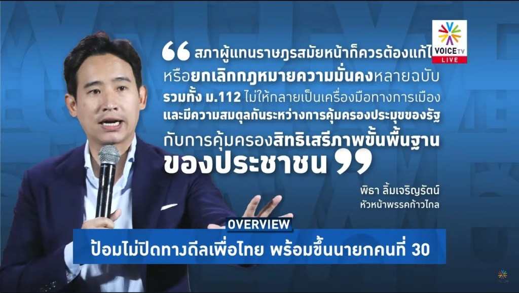 ทางด้านพรรคการเมืองนายพิธา ลิ้มเจริญรัตน์ หัวหน้าพรรคก้าวไกลได้แสดงความเห็นและจุดยืนของพรรคก้าวไกลโดยกล่าวว่า หนึ่ง ยุติการดำเนินคดีการเมือง และสอง นิรโทษกรรมนักโทษคดีการเมือง เพื่อคืนความยุติธรรม ลดความขัดแย้งทางการเมือง และเปิดทางให้ใช้กระบวนการทางประชาธิปไตยแก้ปัญหาการเมืองที่สะสมมานับตั้งแต่การรัฐประหารปี 2549 นอกจากนั้นสามสภาผู้แทนราษฎรสมัยหน้าควรต้องแก้ไขหรือยกเลิกกฎหมายความมั่นคงหลายฉบับ รวมทั้ง ม.112
