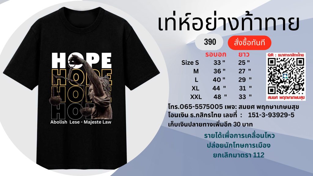 แต่งตัวแนวสตรีทด้วยเสื้อยืดสีดำ สกรีนลายให้ความหมายยุคสมัยด้วยพลังแห่งความหวังของการยกเลิกมาตรา 112 เท่ห์อย่างท้าทายไปทุกที่ กับเสื้อยืดคอกกลมสีดำ HOPE ผ้าคอตตอน 100% ยืดไม่ต้องรีด ซับเหงื่อ นุ่มละมุน เย็นสบาย มีติดตู้ไว้ยืนพื้น หยิบมาสวมใส่ได้หลายโอกาส Size: S/M/L/XL/2XL ในราคา 390 บาท (รวมค่าส่ง)