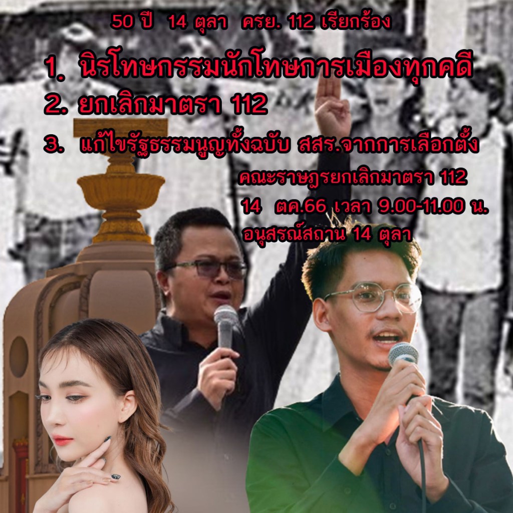 ในโอกาสครบรอบ 50 ปีเหตุการณ์ 14 ตุลา 2516 คณะราษฎรยกเลิก 112 (ครย.112) ขอร่วมรำลึกถึงผู้เสียชีวิตในเหตุการณ์ครั้งนั้นและยืนยันสานต่อเจตนารมณ์ของคนเดือนตุลา 2516 โดยมีเรียกร้องดังต่อไปนี้