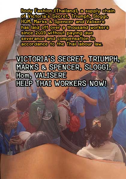 นับตั้งแต่เดือนตุลาคม ปี 2562 เป็นต้นมาจนถึงปี 2564 แรงงานบริษัทบอดี้แฟชั่นทั้ง 3 สาขา ถูกทยอย เลิกจ้างลอยแพมาตลอด รวมแล้วจำนวนกว่า 1,174 คน รวมเป็นจำนวนเงินขั้นต่ำ 101,941,799.45 บาท (ไม่รวม ดอกเบี้ยชำระปรับ) โดยบางสาขาไม่ได้รับค่าจ้างตั้งแต่ปี 2562 ไม่ได้รับโบนัส และค่าสวัสดิการต่าง ๆ ตามกฎหมาย คุ้มครองแรงงานกำหนด แม้จะมีคำสั่งศาลให้นายจ้างจ่ายให้แรงงานทั้ง 3 สาขาพร้อมดอกเบี้ยชำระปรับตามอัตรา ต่าง ๆ แล้วก็ตาม ปัจจุบันแม้กระบวนการทางกฎหมายจะสิ้นสุดลงแล้ว โดยศาลจะมีคำสั่งยึดทรัพย์นายจ้างและรอ ขายถอดตลาด หากแต่หน่วยงานที่เกี่ยวข้อง รวมถึงนายจ้างกลับไม่มีการเคลื่อนไหวใด ๆ เพื่อช่วยเหลือแรงงานที่รอ คอยเงินก้อนสุดท้ายในการไปตั้งต้นชีวิตการทำงานใหม่อย่างไม่เป็นธรรม โดยขอเรียกร้องดังต่อไปนี้