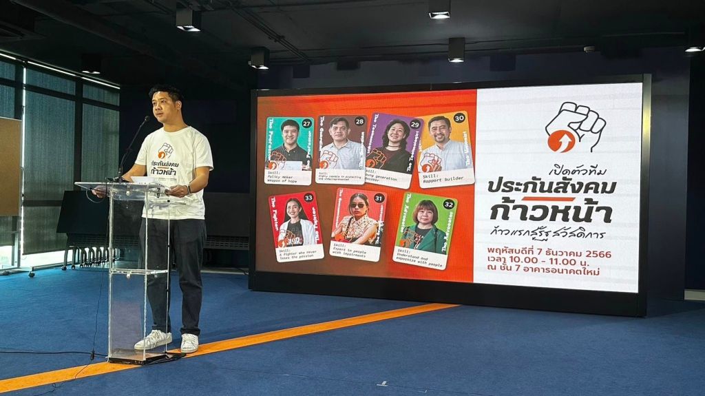 7 ธ.ค. 66 ‘ธนาธร’ ร่วมกับทีมประกันสังคมก้าวหน้า นำโดยอาจารย์ ‘จั๊ก’ ษัษฐรัมย์ ธรรมบุษดี ประกาศเปิดตัวผู้สมัครฝั่งผู้ประกันตนทั้ง 7 คน เบอร์ ‘27 ถึง 33’ ในสนามเลือกตั้งบอร์ดประกันสังคมระดับประเทศ ชูนิมิตรหมาย ‘ก้าวแรกสู่รัฐสวัสดิการ’ ปักธงชัด “พวกเราคือปีศาจร้ายของชนชั้นนำ…”