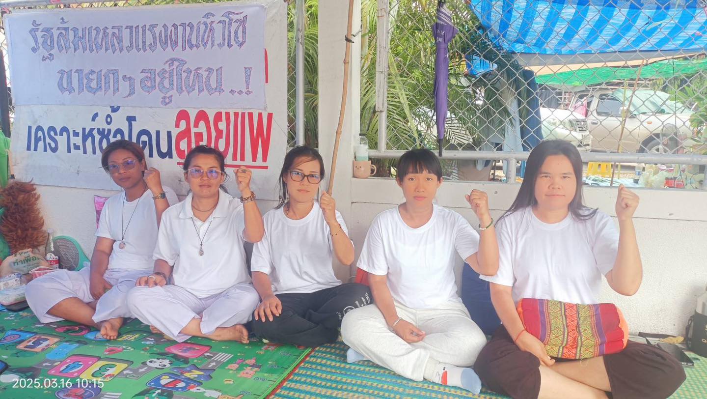คุณมาลี เตวิชา ธนพร เลิศล้ำ สุนิสา บุญนิล, คุณวิไล โทกอุทา และ คุณกรรณิการ์ สนาท ตัวแทนคนงานยานภัณฑ์ อดอาหารประท้วงตั้งแต่วันที่ 12 มีนาคม 2568 เพื่อเรียกร้องให้ ครม. เร่งเคาะงบกลางช่วยเหลือคนงานที่ถูกเลิกจ้างโดยไม่ได้รับเงินค่าชดเชย