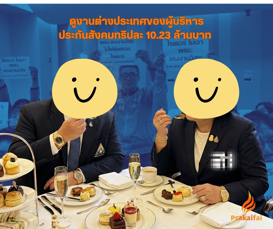 การดูงานของผู้บริหารประกันสังคมเป็นข้ออ้างล้างผลาญงบประมาณ เป็นเสมือนได้ไปท่องเที่ยวต่างประเทศมากกว่า และช่วยทำกำไรให้กับธุรกิจท่องเที่ยวที่เป็นคนจัดการดูงานให้ เป็นธุรกิจที่มีความสัมพันธ์กับบอร์ดประกันสังคมและข้าราชการกระทรวงแรงงาน นอกจากเป็นการล้างผลาญงบประกันสังคมแล้ว ยังเป็นช่องทางการติดสินบนให้คนในประกันสังคมอีกด้วย หลายคนไปดูงานกลับมาพร้อมกับสินค้าแบรนด์เนมหรูหรา โดยเฉพาะนาฬิการาคาหลักล้าน ลองไปส่องนาฬิกาของอดีตผู้นำแรงงาน ฝ่ายนายจ้างและข้าราชการในบอร์ดประกันสังคมก็จะพบความหรูหราผิดปกติของคนเหล่านี้