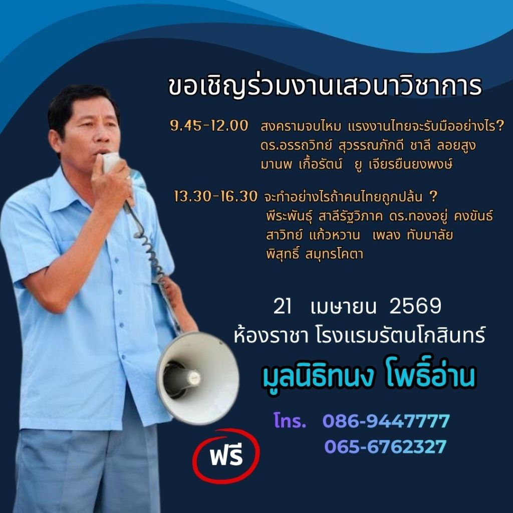มูลนิธิทนง โพธิ์อ่าน จะจัดให้มีการสัมมนาทางวิชาการในหัวเรื่อง สงครามพลังงาน แรงงานไทย วันอังคารที่ 21 เมษายน 2569 ที่ห้องราชา โรงแรมรัตนโกสินทร์ ถนนราชดำเนิน